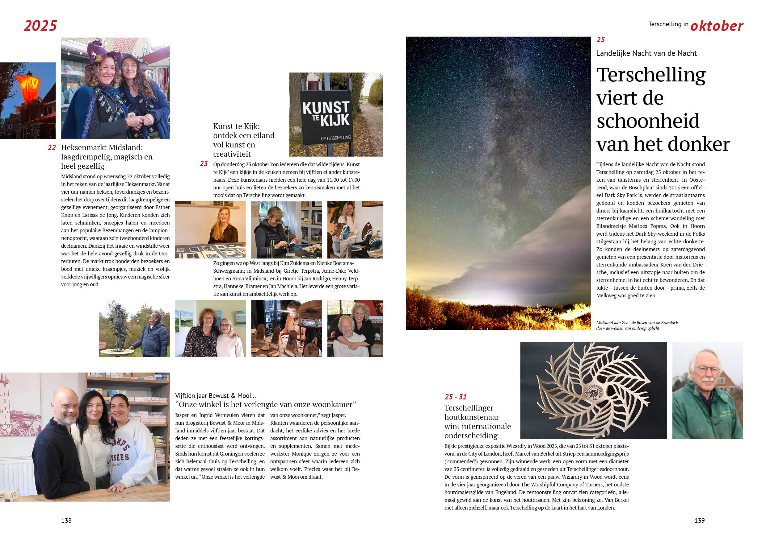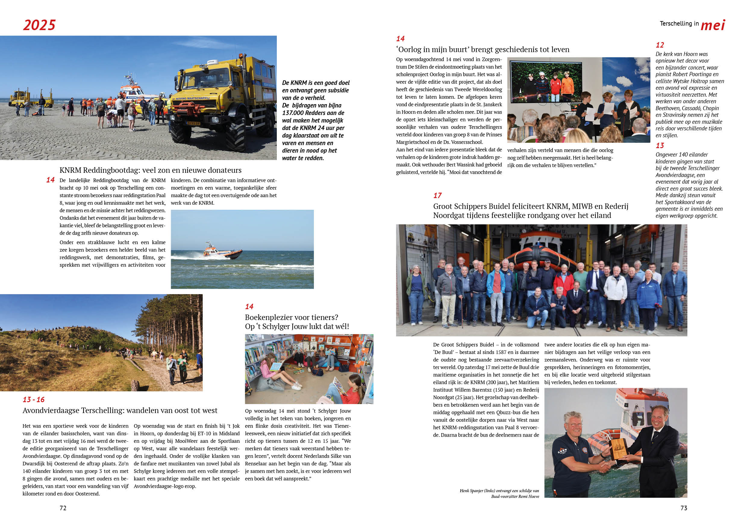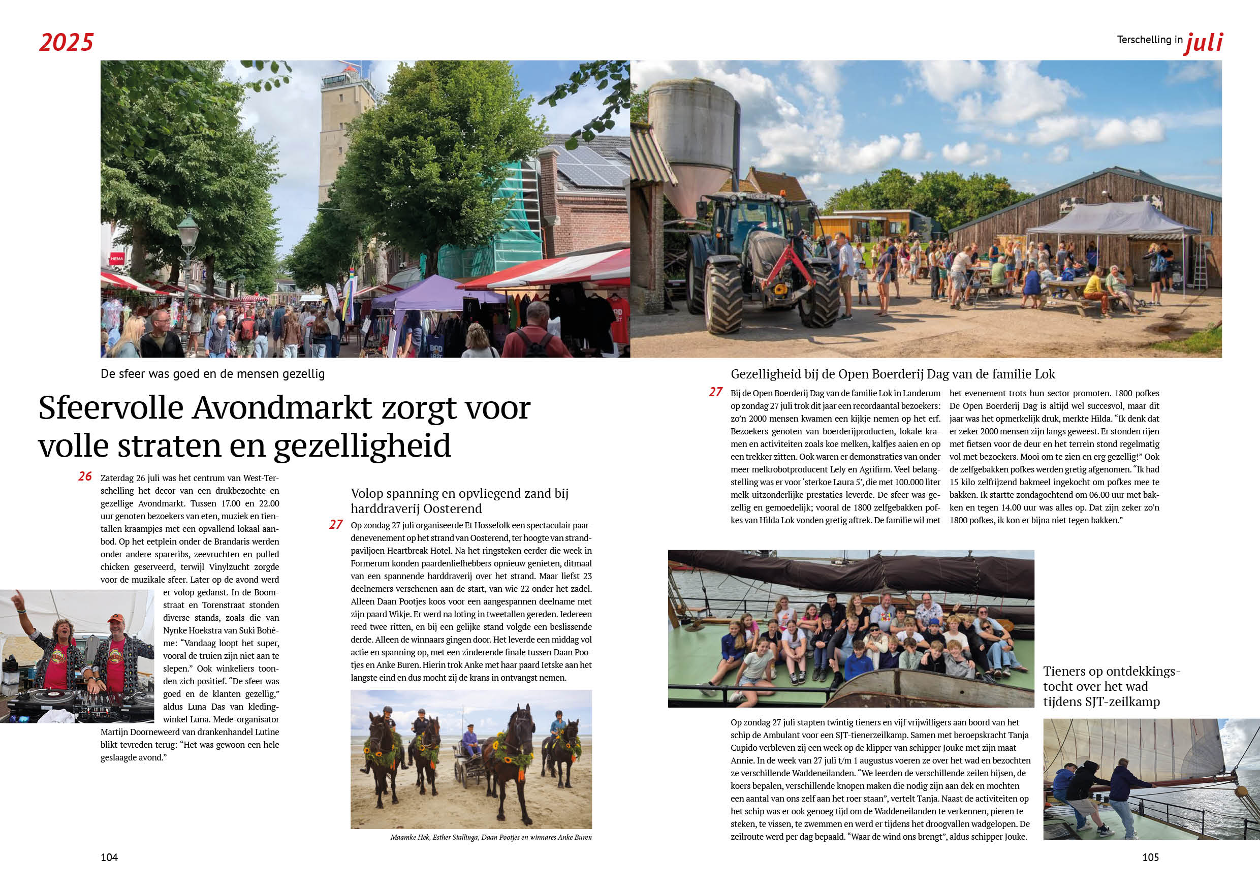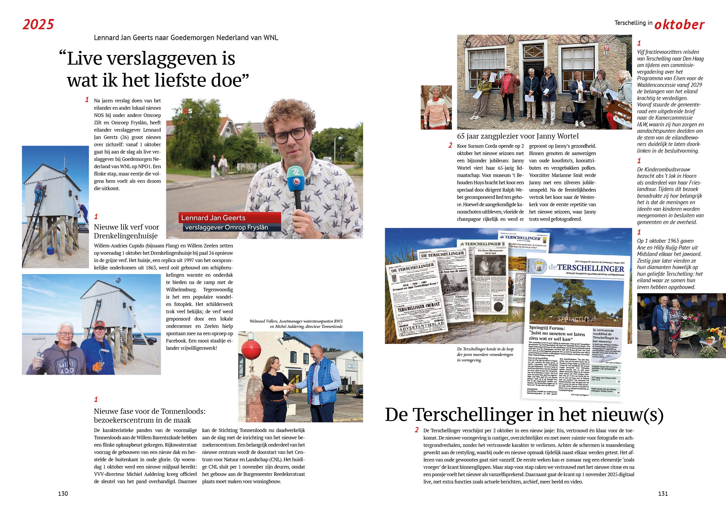 In dit boek lees je de verhalen die 2025 kleur gaven: markante eilanders, iconische gebeurtenissen, bijzondere foto’s, vergeten anekdotes en scherpe reflecties op een jaar dat sneller voorbijging dan we wilden. Denk aan lokale politiek, cultuur, sport, natuurontwikkelingen, ondernemersverhalen en bijzondere eilandmomenten. Of je nu het hele jaar op het eiland woont, er slechts één week per jaar bent, of juist heimwee voelt zodra de boot afvaart, het Jaarboek Terschelling 2025 brengt het gevoel van thuiskomen terug. Boordevol foto’s, redactionele hoogtepunten, interviews en terugblikken is het een naslagwerk dat je blijft openslaan.